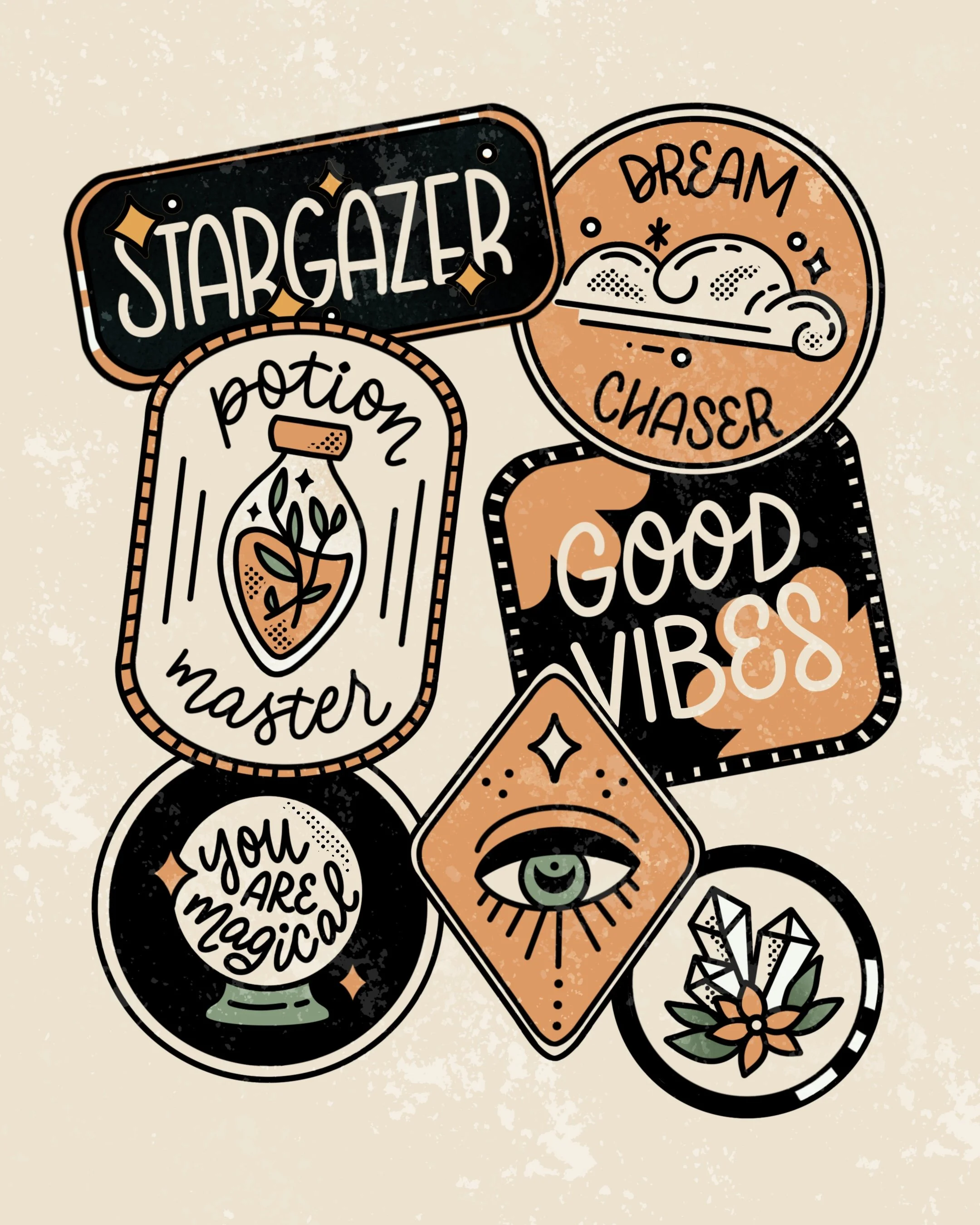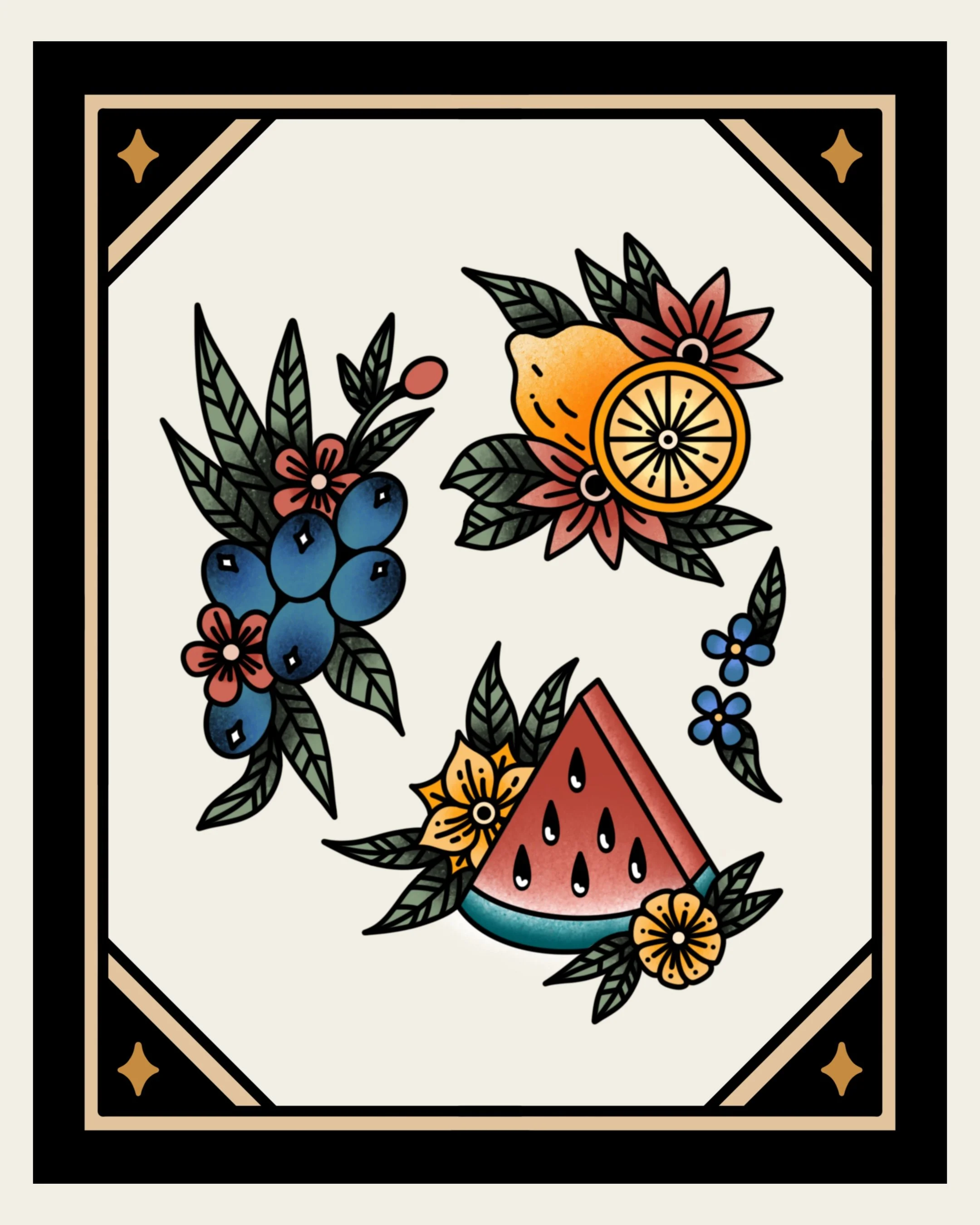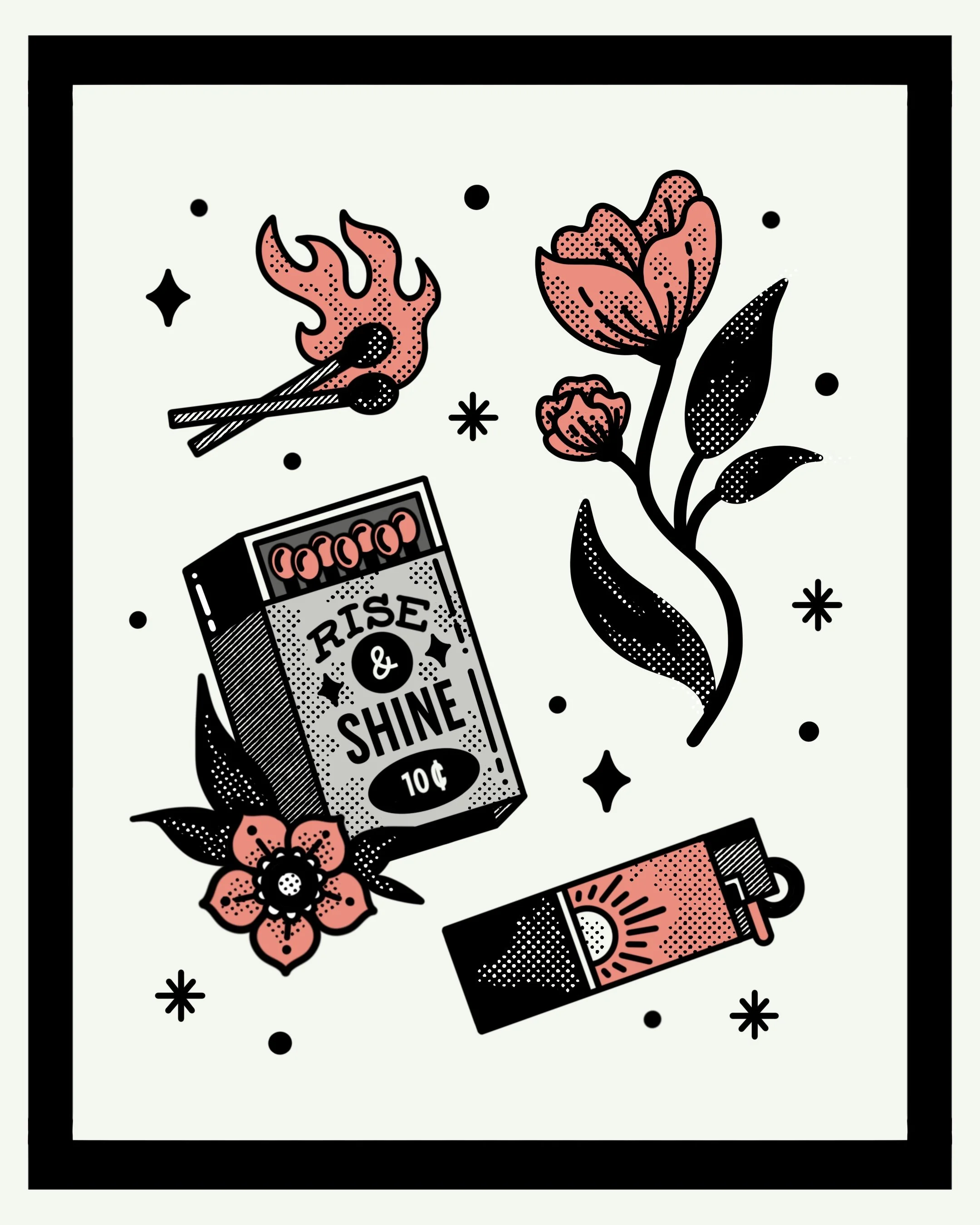 Camp Create is a summer-themed drawing challenge hosted by a talented group of artists and designers on Instagram. Inspired by this super fun prompt, I crafted a series of eight whimsical and vibrant illustrations that span my art style. From tattoo-inspired flash sheets to Scandinavian folk art-inspired patterns, each piece captures the essence of summer through a unique and playful lens! This collection reflects my love for exploring different art styles and the magic of summer memories.